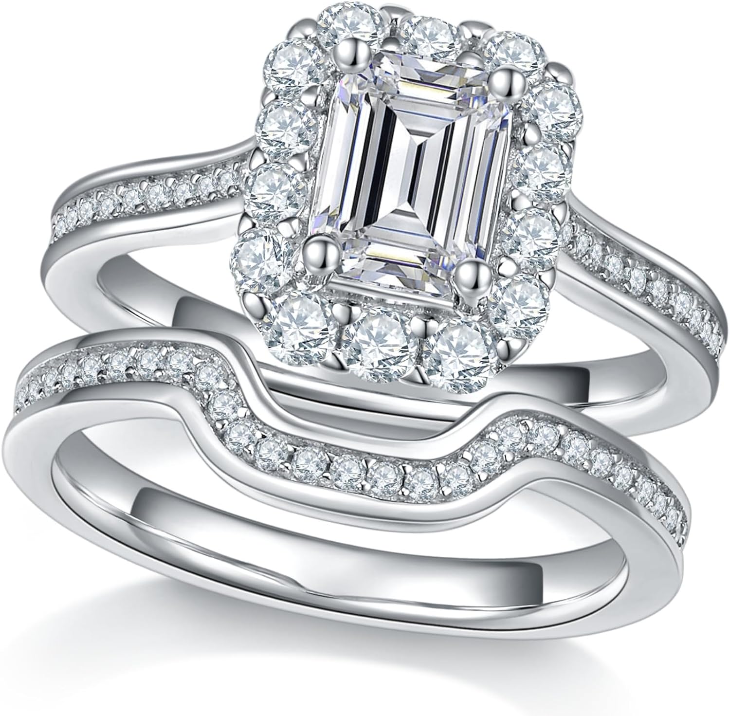 xCelebrate luxury and brilliance with this emerald cut halo Moissanite bridal set. Expertly crafted in 925 sterling silver, this 2-piece design features a stunning emerald cut Moissanite engagement ring surrounded by a sparkling halo, paired with a perfectly matching wedding band. With its elegant step-cut design, halo sparkle, and timeless sophistication, this set is perfect for weddings, anniversaries, or as a meaningful promise ring for her.