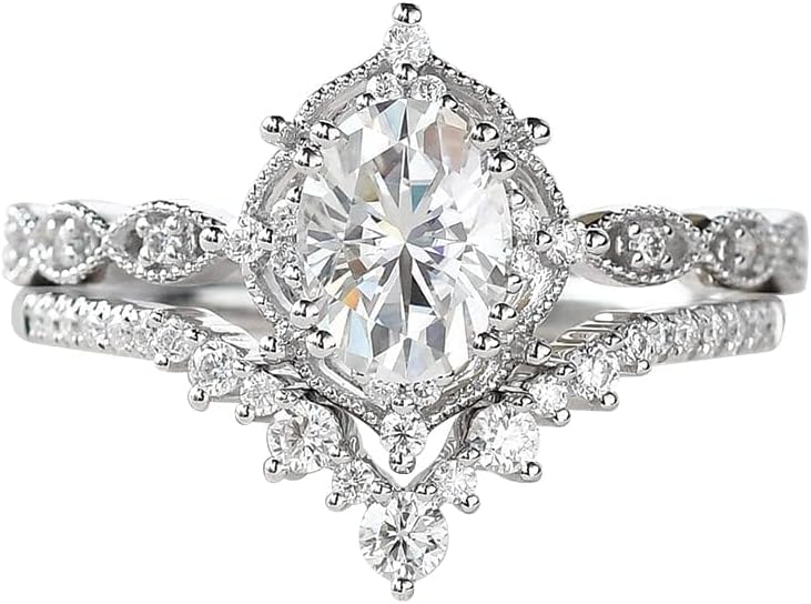 2 PC Oval Cut Moissanite Vintage Vine V-Shaped Sterling Silver Bridal Wedding & Engagement Ring Set for Women