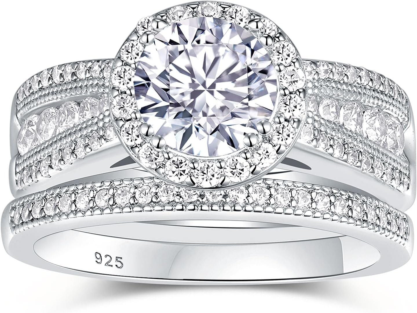 xCelebrate sparkle and elegance with this round brilliant cut Moissanite bridal set. Expertly crafted in 925 sterling silver, it features a dazzling round brilliant cut Moissanite in a radiant halo setting, paired with a triple-row accented wedding band for added brilliance. With its glamorous halo design, sparkling accents, and lasting beauty, this set is perfect for weddings, anniversaries, or as a meaningful promise ring for her.