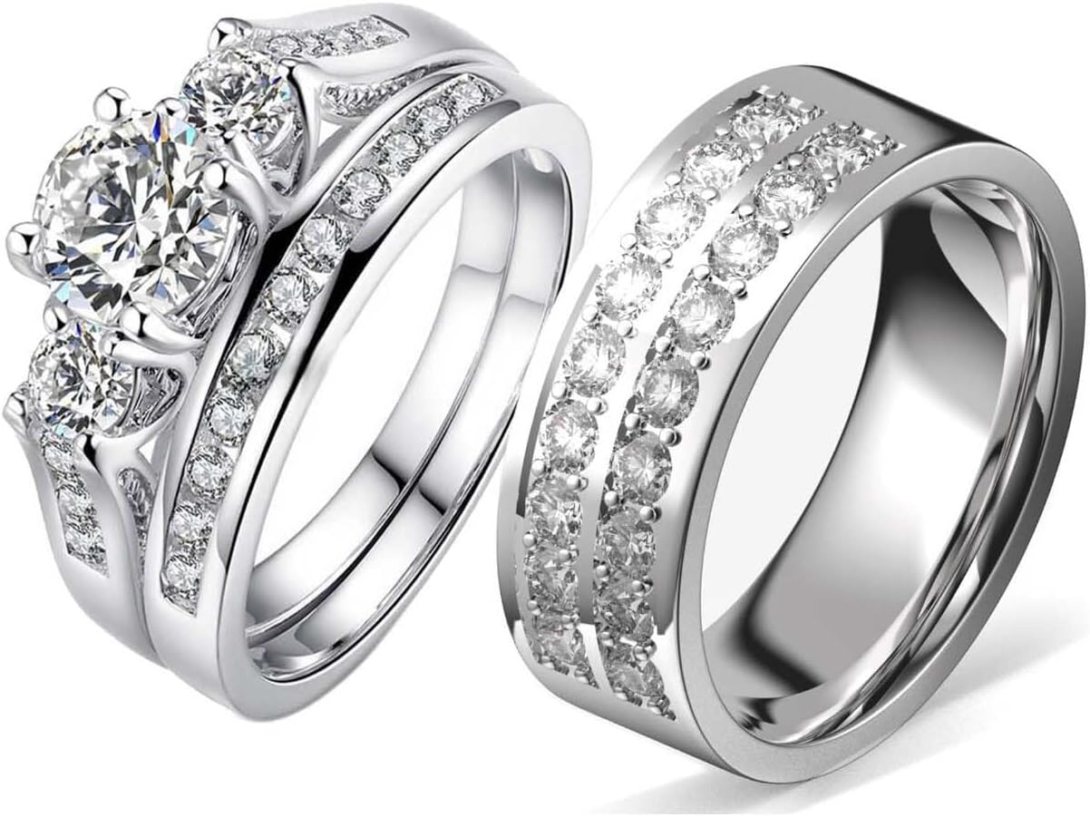 Round Brilliant Cut Moissanite Sterling Silver His and Hers Wedding Ring Set Couples Promise & Bridal Bands