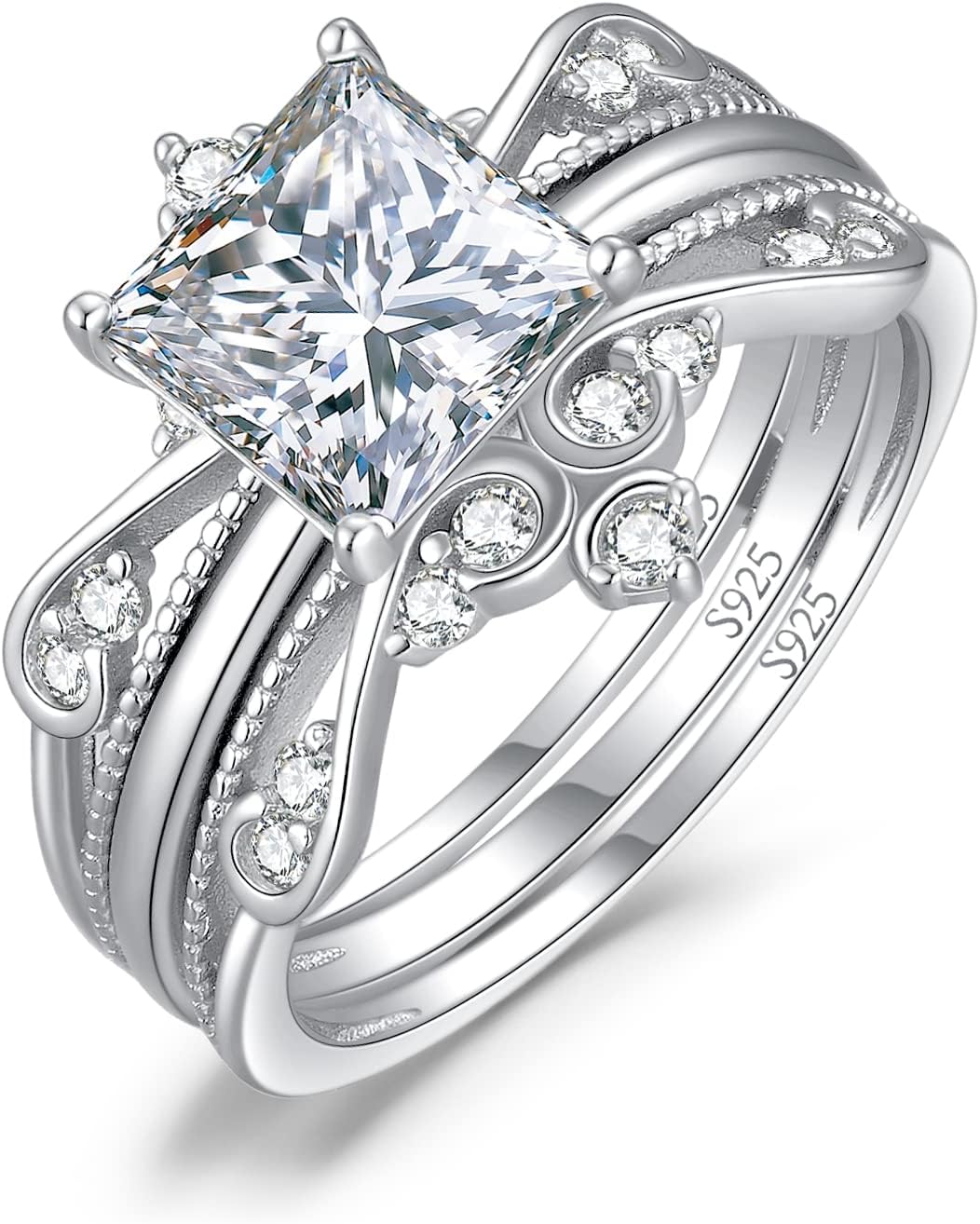 2 PC Vintage Princess Cut Moissanite Solitaire Sterling Silver Bridal Engagement & Crown Enhancer Wedding Ring Set