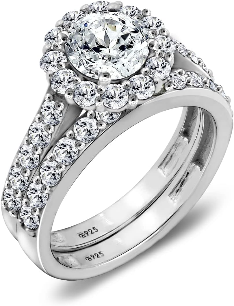 2 PC Round Brilliant Cut Moissanite Sterling Silver Double Halo Flower Bridal Engagement Ring Set with Infinite Elements