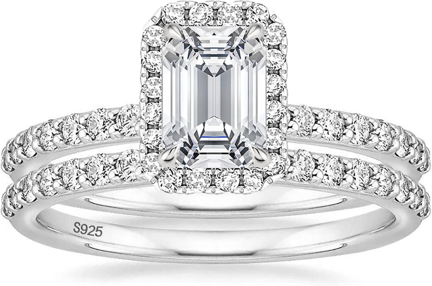 xTimeless and elegant, this bridal set highlights a stunning emerald cut moissanite set in 925 sterling silver with vintage-inspired details. The matching wedding band completes the set, making it perfect for engagements, weddings, anniversaries, or as a cherished promise ring.