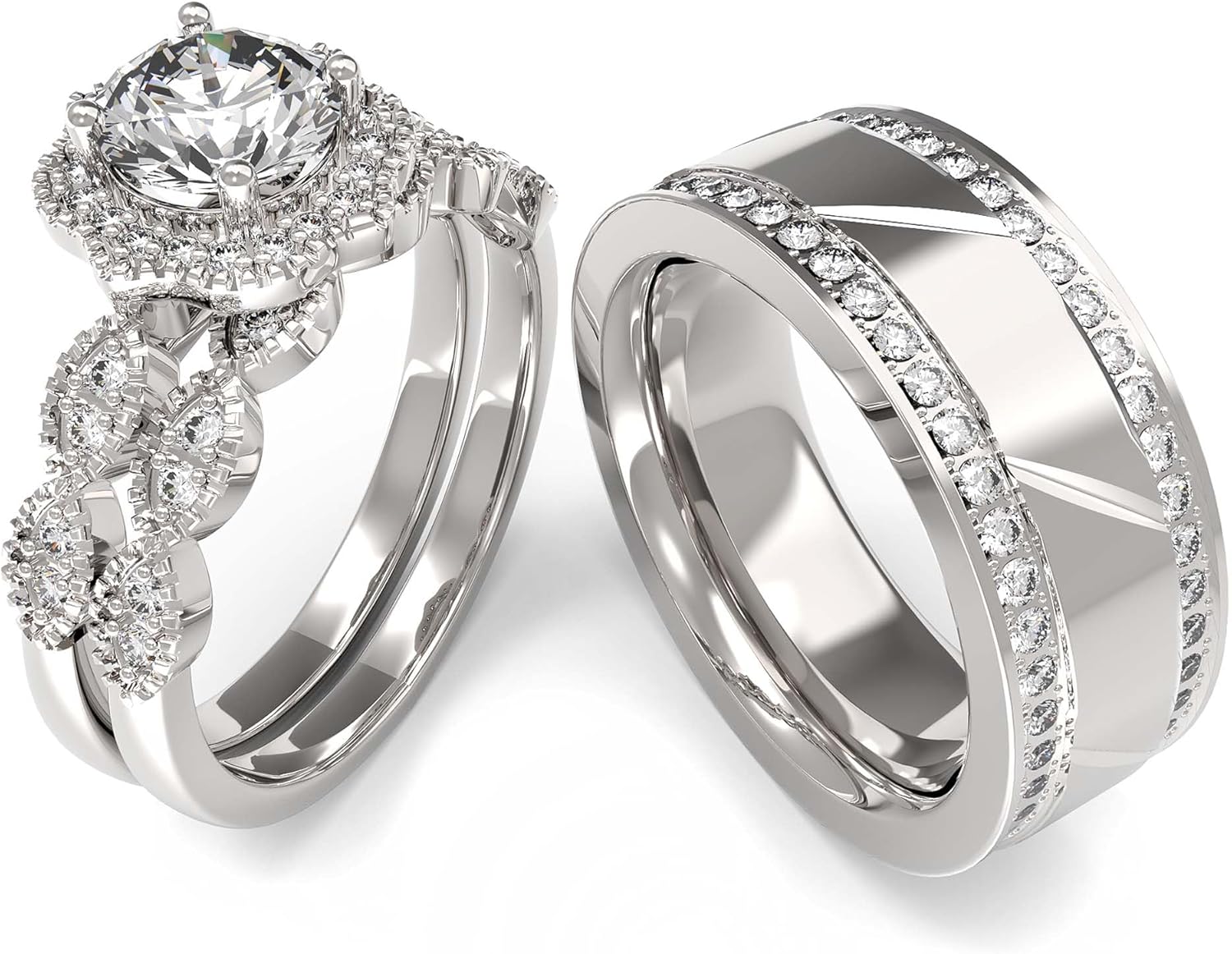 Round Brilliant Cut Moissanite Sterling Silver His and Hers Wedding Ring Set – Couples Promise Bands