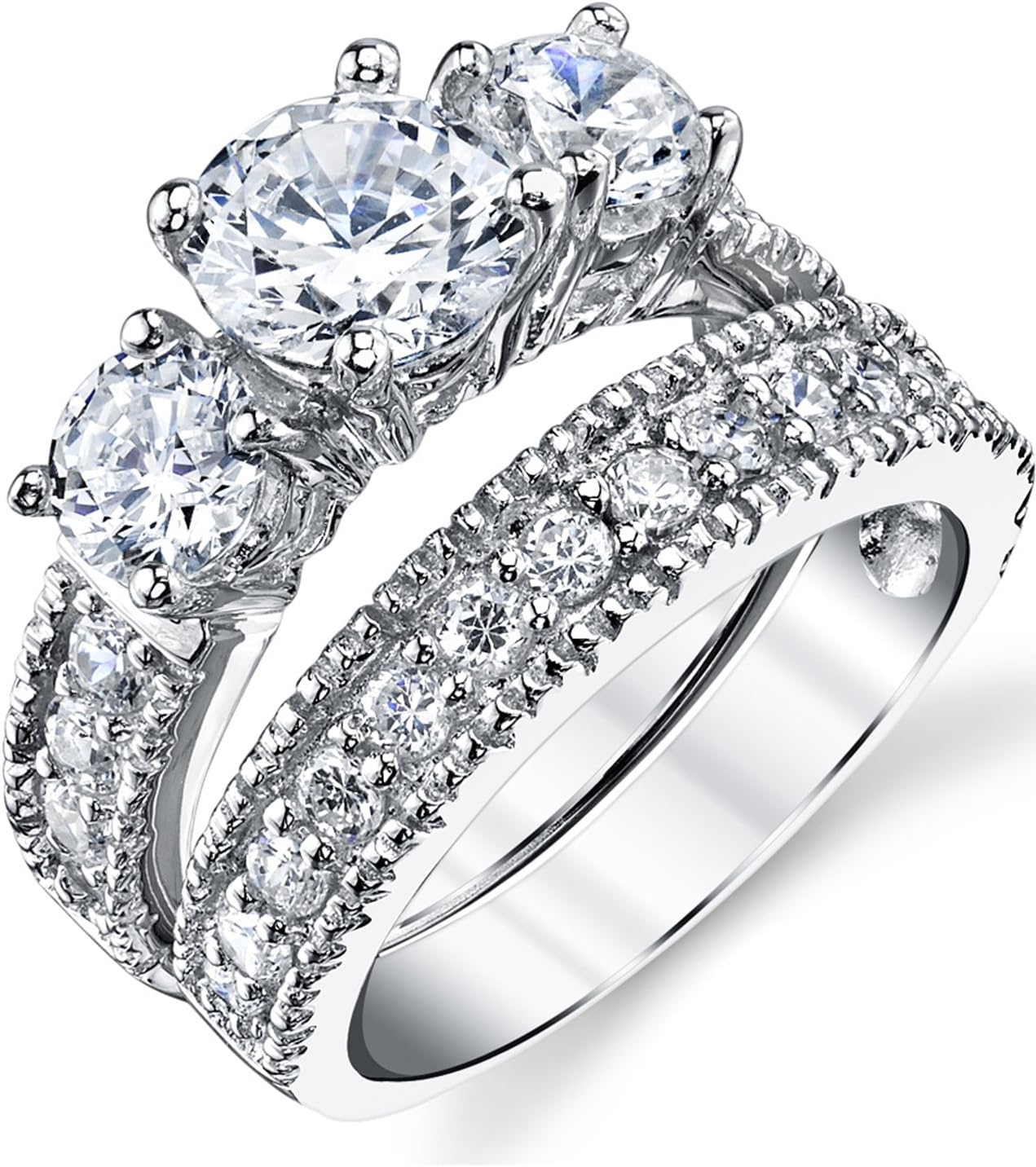 2 PC, 3 Stone Round Cut Moissanite Sterling Silver Past Present Future Bridal Engagement & Wedding Ring Set