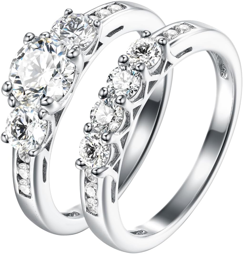 2PC Round Cut Moissanite 3-Stone Sterling Silver Engagement Ring Set for Women