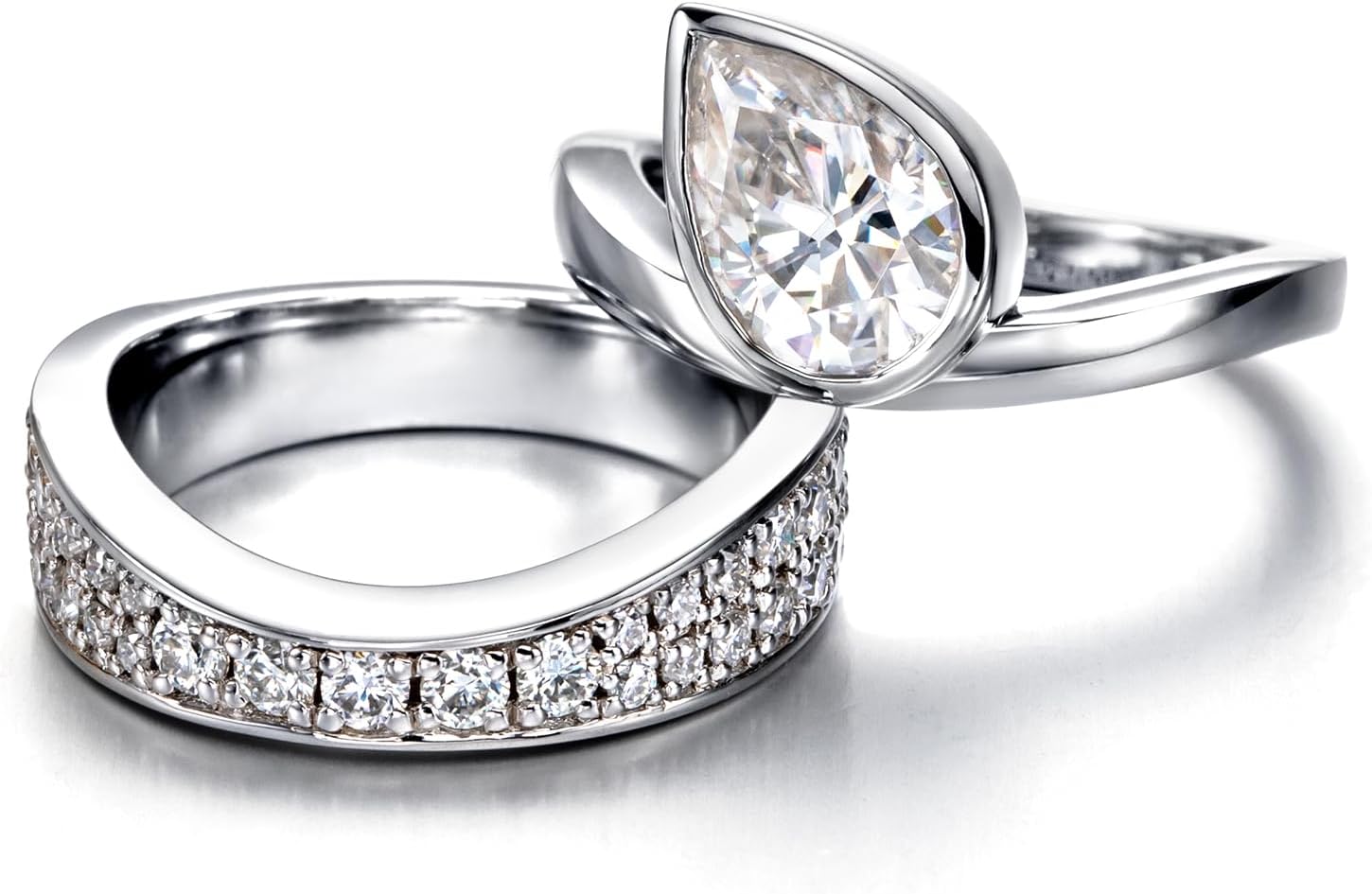 Celebrate modern sophistication with this 2-piece pear cut crushed ice Moissanite bridal ring set. Expertly crafted in sterling silver, it features a dazzling pear-shaped crushed ice Moissanite...