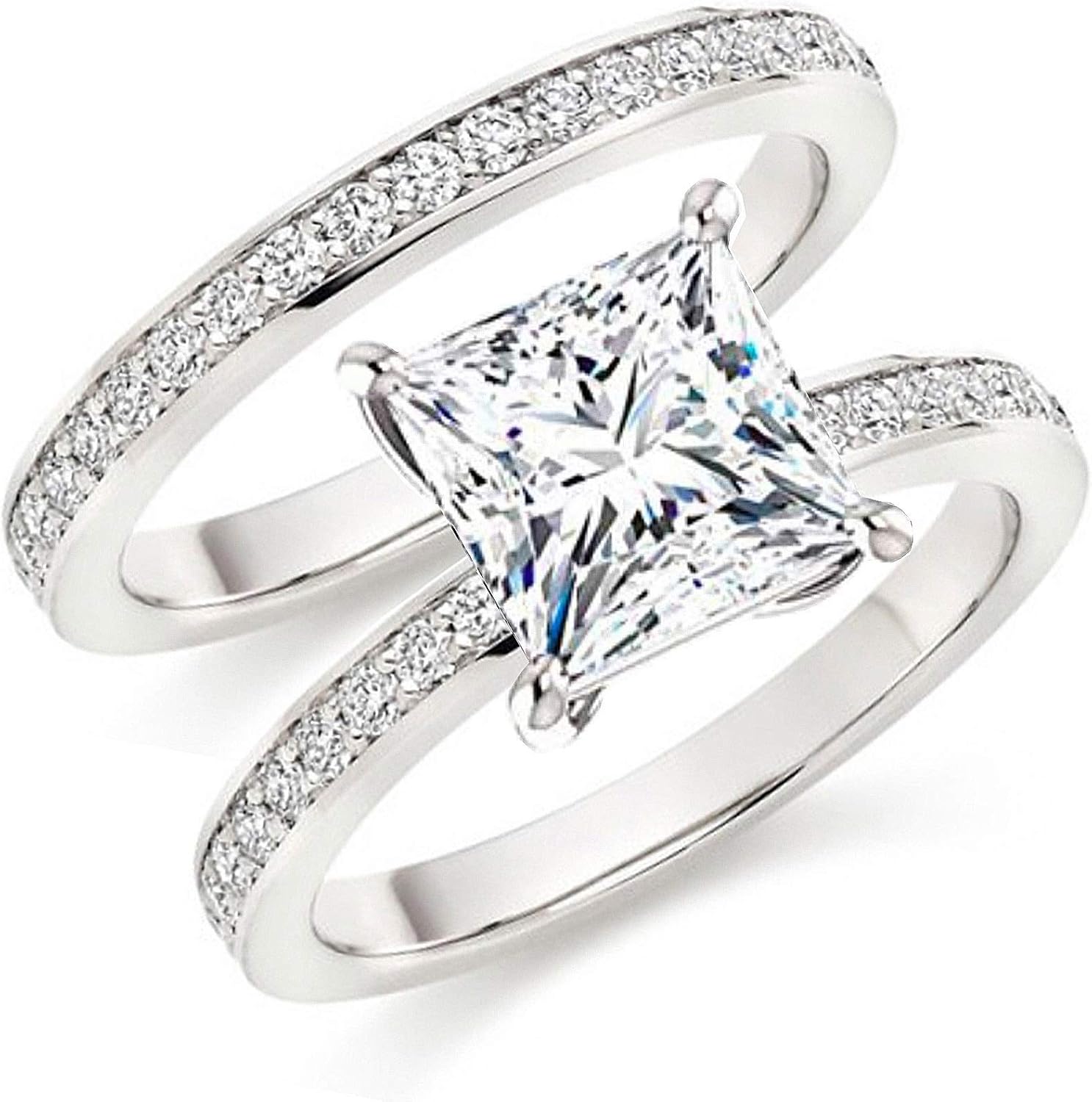 2 PC Princess Cut 101 Facets Simulated Moissanite 925 Sterling Silver Bridal Wedding Band Set