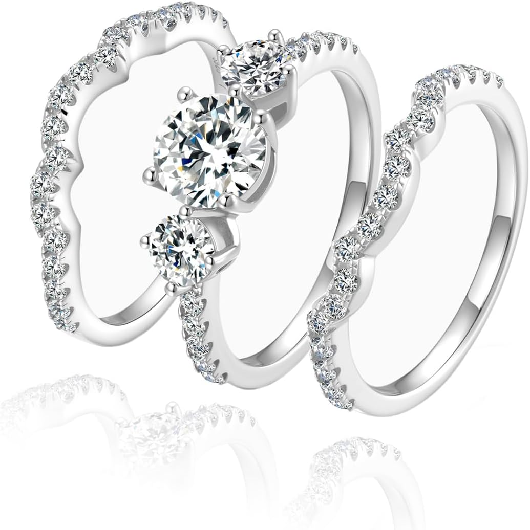 xCelebrate everlasting love with this 3-piece round brilliant cut Moissanite bridal set. Expertly crafted, it features a stunning 3-stone round brilliant cut Moissanite engagement ring, symbolizing past, present, and future, paired with two perfectly matching wedding bands. With its timeless brilliance and versatile trio design, this set is ideal for weddings, anniversaries, or as a meaningful promise ring for her.