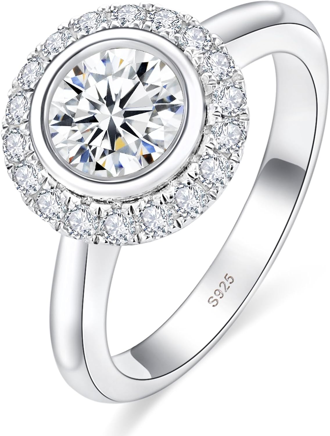 Round Cut Moissanite Sterling Silver Halo Engagement Ring with Wedding Band Promise & Anniversary Bridal Set for Women