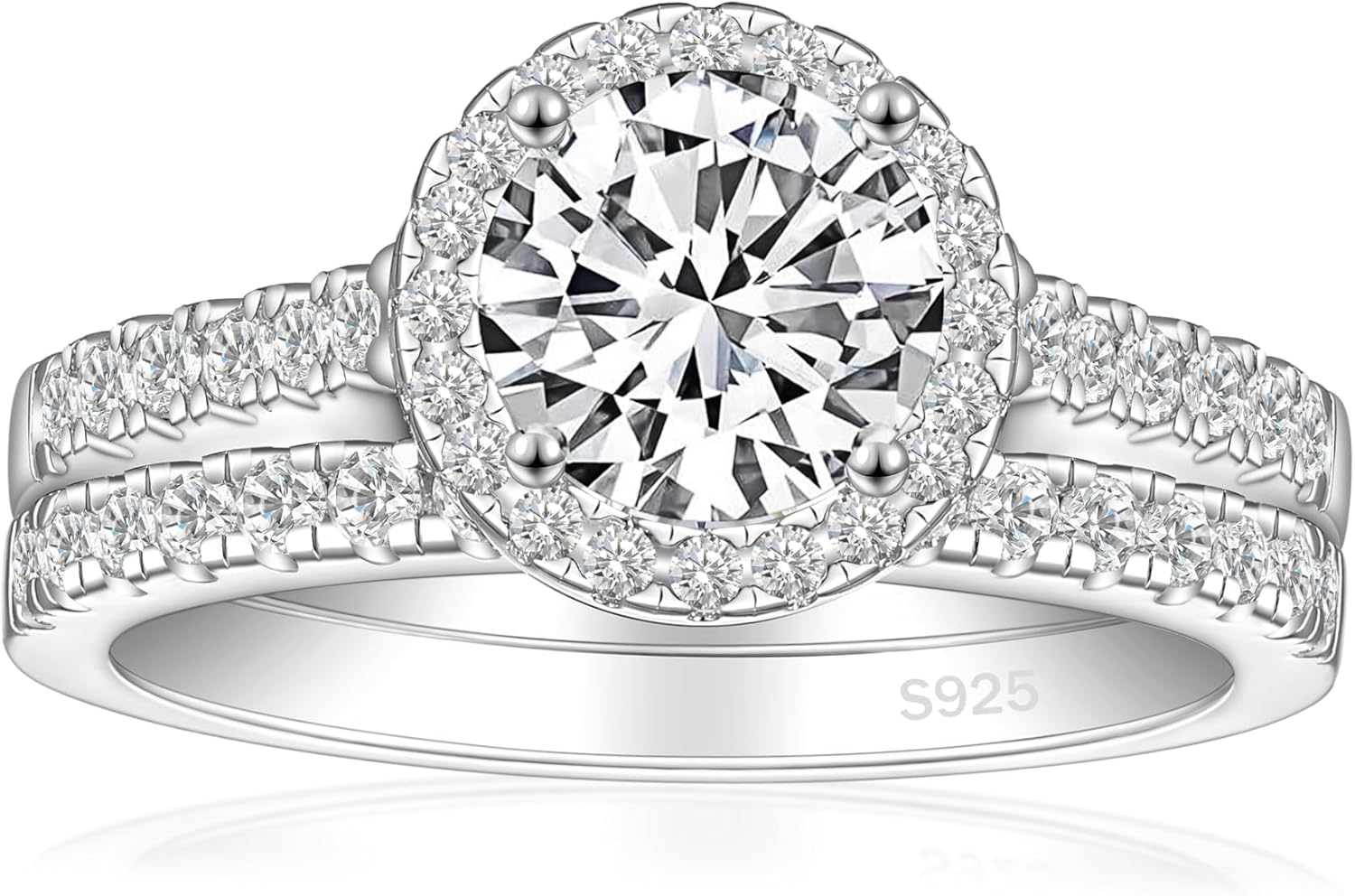 2 PC Round Cut Halo Moissanite Sterling Silver Bridal Wedding & Engagement Ring Set for Women
