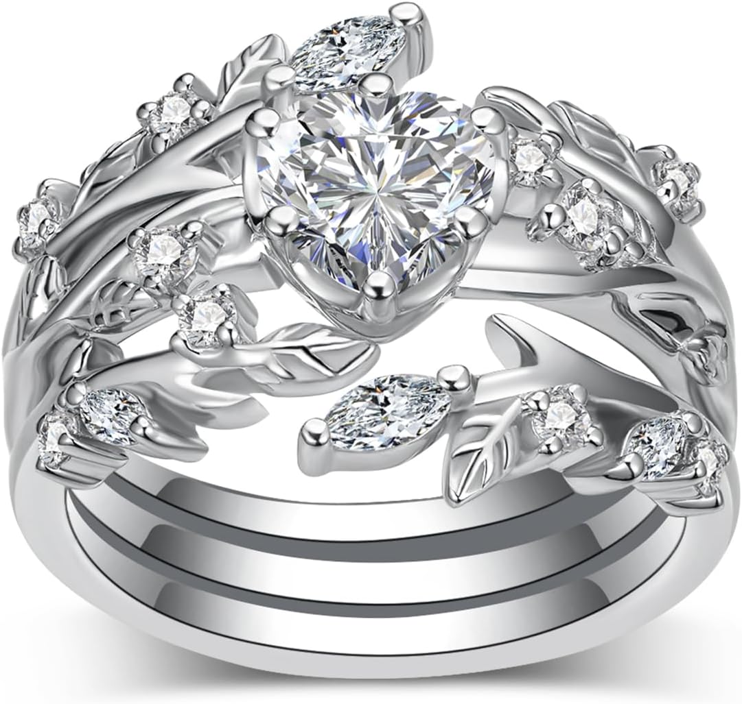 xCelebrate romance and elegance with this 3-piece heart cut Moissanite bridal set. Expertly crafted in 925 sterling silver, it features a sparkling heart cut Moissanite engagement ring with a leaf-inspired design, paired with two perfectly matching wedding bands. With its symbolic heart shape, nature-inspired details, and lasting brilliance, this set is ideal for weddings, anniversaries, or as a meaningful promise ring for her.