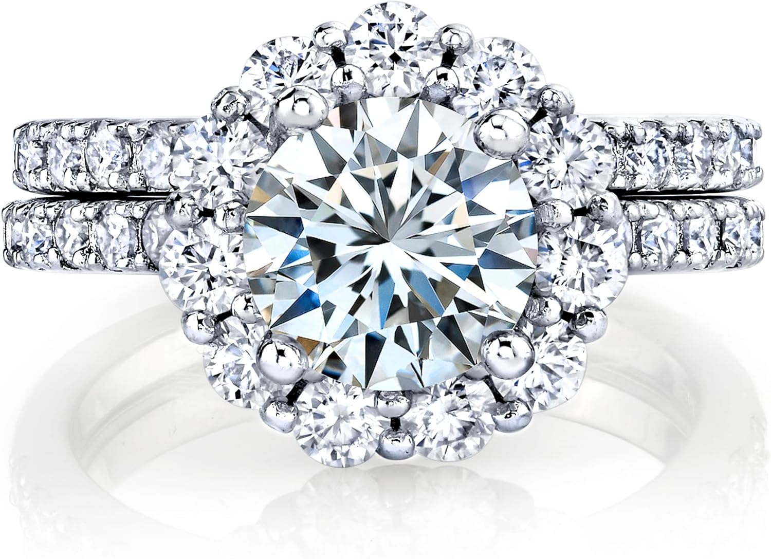 2 PC Round Moissanite Crown Halo Sterling Silver Bridal Wedding & Engagement Ring Set for Women